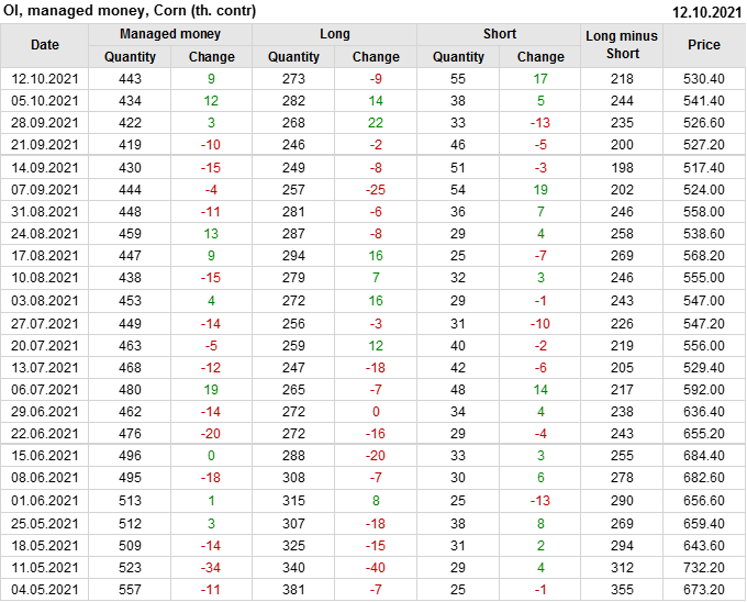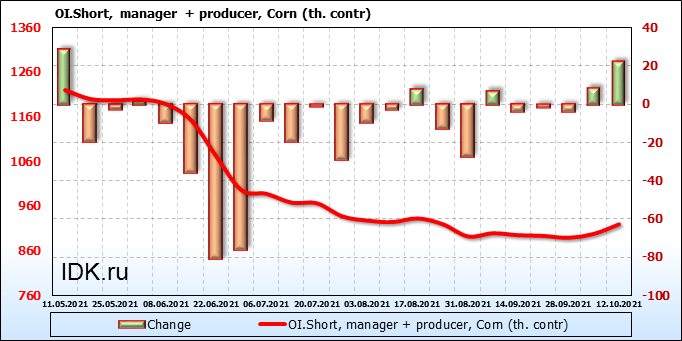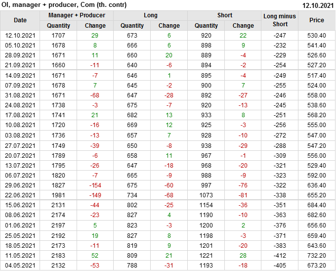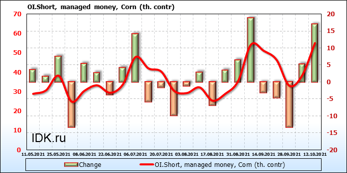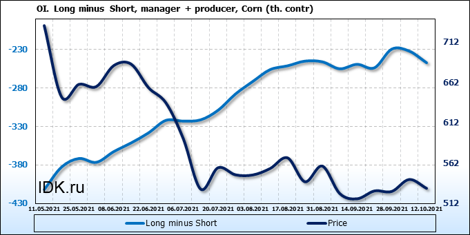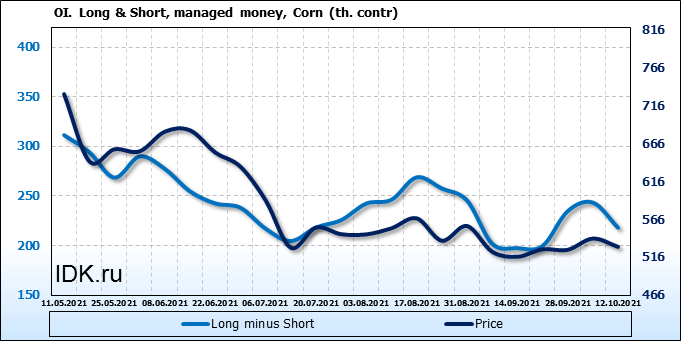 За прошлую неделю, 06.10.21 — 12.10.21, разница между длинными и короткими позициями управляющих сократилась на 25.4 тыс. контрактов. В тоже время, цена упала на 11 центов.