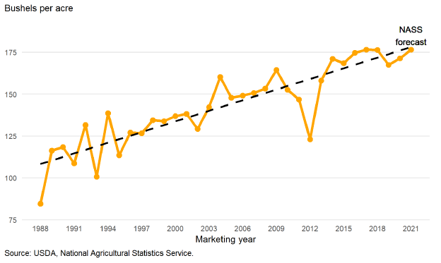 Рисунок 1. Урожайность кукурузы в США с 1988 по 2021 гг.