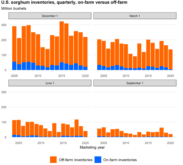 Рисунок 10. Запасы сорго в США поквартально, на фермах и вне ферм.