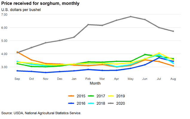 В октябрьском отчете WASDE прогнозируется, что производство сорго составит 471 миллион бушелей, что на 17 миллионов бушелей больше, чем ожидалось в сентябре. Увеличение производства сорго происходит за счет увеличения прогнозируемой средней урожайности на 2,6 бушелей с акра до 72,3 бушелей с акра, согласно октябрьскому отчету NASS. Уборочная площадь остается неизменной и составляет 6,5 млн акров.