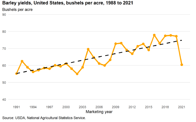 Рисунок 12. Урожайность ячменя в США с 1988 по 2021 гг., бушелей на акр.