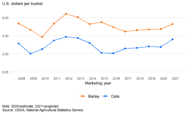 Ожидается, что относительно небольшие запасы приведут к ограниченным остаткам и потреблению. Кормовое и остаточное потребление в 2021/22 году прогнозируется на уровне 40 миллионов бушелей — это сокращение на 5 миллионов бушелей по сравнению с сентябрем и резкое падение с уровня 2020/21 года в 68 миллионов бушелей. Конечные остатки прогнозируются на уровне 25 миллионов бушелей — снижение на 3 миллиона бушелей по сравнению с сентябрем и самый низкий уровень за всю историю наблюдений. В результате средняя сезонная цена на овес фермерских хозяйств прогнозируется на уровне 3,60 доллара США, без изменений по сравнению с сентябрем.