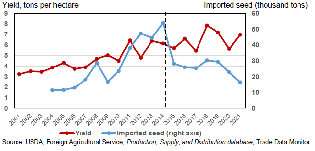 Еще одна важный фактор для урожайности украинской кукурузы — это использование улучшенных гибридных семян. Импорт таких семян начал расти в 2010 году, примерно в то же время, когда начали расширяться посевы кукурузы. Однако в 2014 году украинская гривна начала резко дешеветь, что сделало импортные семена намного дороже для производителей. Это, в свою очередь, дало стране мощный стимул к развитию собственной семеноводческой отрасли. После 2014 года страна все больше полагалась на отечественные гибридные семена по экономическим соображениям, сокращая при этом импорт семян. Хотя использование гибридных семян повысило урожайность кукурузы, похоже, что семена местного производства в основном уступают импортным, что замедляет рост урожайности. Несмотря на рекордную площадь, импорт гибридных семян в 2021 году будет самым низким за 15 лет и примерно на 70 процентов ниже пика 2014 года (см. рисунок 15), резкое сокращение за последние 2 года также может быть связано с текущими перебоями в мировой торговле всеми видами сырья.