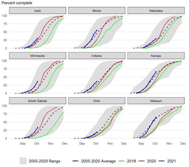 Сбор урожая кукурузы продолжает продвигаться стабильными темпами в начале октября. Согласно отчету NASS, по состоянию на 3 октября урожай кукурузы в США был собран на 29 процентов по сравнению с 15 процентами в 2020/21 году и средним показателем после 2005 года на уровне 21 процента. Те же тенденции сохраняются и для большинства основных штатов-производителей кукурузы – темпы сбора урожая опережают 2020/21 год и соответствуют долгосрочным средним показателям.