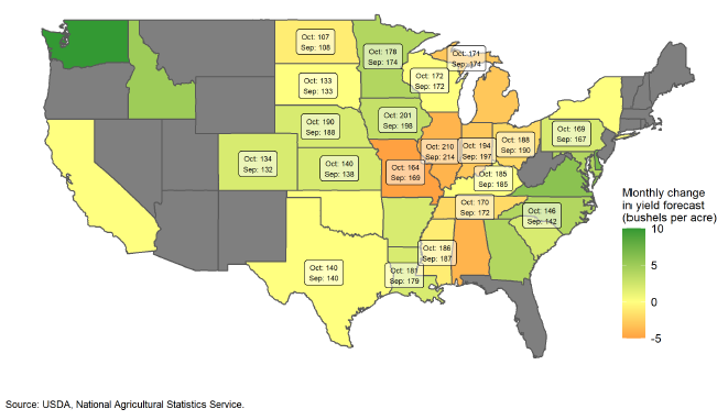 Прогнозы урожайности в Восточном кукурузном поясе были снижены, в том числе в Иллинойсе (на 4 бушеля на акр до 210), Индиане (на 3 бушеля на акр до 194) и Огайо (на 2 бушеля на акр до 188). Изменения прогнозов для штатов Западного кукурузного пояса были в основном повышены, в том числе: в Айове (на 3 бушеля на акр до 201), Миннесоте (на 4 бушеля на акр до 178), Небраске (на 2 бушеля на акр до 190), в то время как прогноз для Южной Дакоты остался без изменений — 133 бушеля на акр.