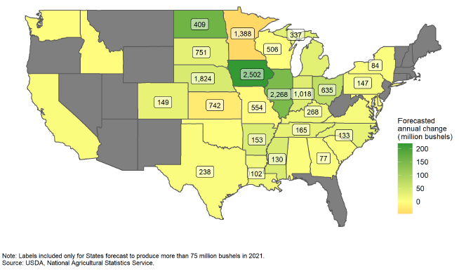 Рисунок 4. Прогноз производства кукурузы в США в 2021 году и изменение год к году, млн бушелей.