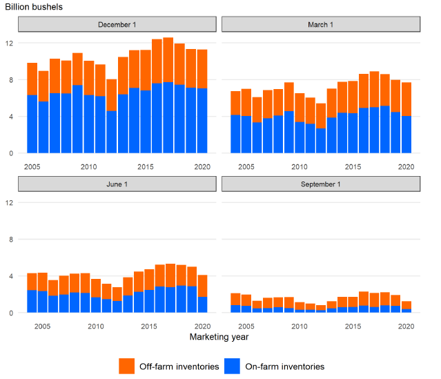 Из общего количества заявленных конечных остатков только 395 миллионов бушелей хранились на ферме по состоянию на 1 сентября, а остальные — в коммерческих хранилищах. Это число резко снизилось с уровня 2020/21 года в 751 миллион бушелей, что отражает высокие рыночные цены.