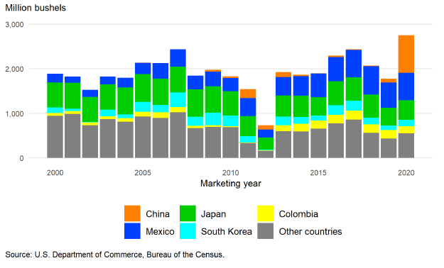 По данным Бюро переписи США, экспорт кукурузы в 2020/21 году составил 2 753 миллиона бушелей, при этом учтены данные за весь маркетинговый год. Этот показатель является новым рекордом для экспорта кукурузы из США и превышает предыдущий максимум в 2 437 миллионов бушелей, достигнутый в 2017/18 году. Экспорт США выиграл от высокого кормового спроса со стороны Китая, а также проблем с производством у других основных экспортирующих стран, особенно Бразилии и Украины.