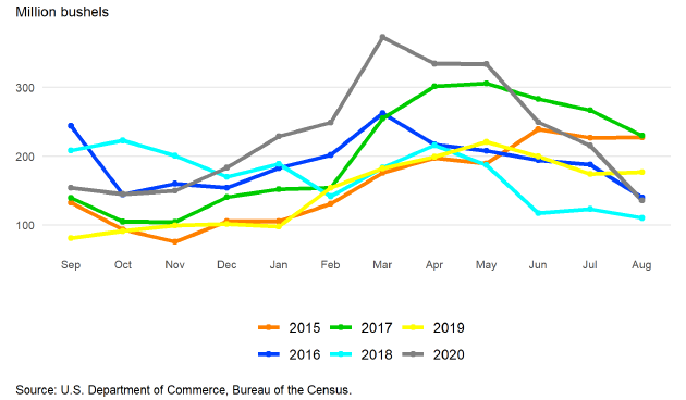 Конечные остатки кукурузы 2020/21 года оцениваются в 1 236 млн бушелей на основании последнего отчета NASS о запасах зерна, опубликованного 30 сентября. Этот показатель представляет собой увеличение на 50 млн бушелей по сравнению с оценкой, приведенной в сентябрьском отчете WASDE. Это наименьший уровень конечных остатков с 2013/14 г. (1 232 миллиона бушелей) и наименьшее соотношение запасов к потреблению — 8,3 процента — с 2012/13 г. (7,4 процента). Общее потребление в 2020/21 году оценивается в 14 819 миллионов бушелей, что немного превышает предыдущий рекорд 2017/18 года в 14 798 миллионов бушелей.