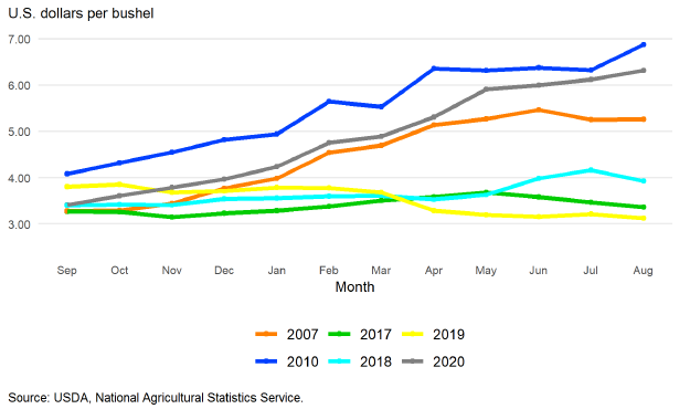 Средняя сезонная цена на кукурузу в 2020/21 году составила 4,53 доллара за бушель, согласно последнему отчету NASS о сельскохозяйственных ценах, опубликованному 30 сентября, что на 0,08 доллара выше сентябрьской оценки WASDE. В отличие от большинства маркетинговых лет, ежемесячные фермерские цены на кукурузу существенно и стабильно росли в течение маркетингового года — с 3,41 доллара за бушель в сентябре 2020 года до 6,32 доллара к августу 2021 года. Аналогичные тенденции роста наблюдались также в 2007 и 2010 годах, но диапазон роста цен в 2020/21 году был больше, чем в любой другой год.