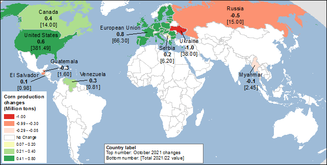 Карта 1. Изменения производства кукурузы (млн. тонн) для 2021/22 года, октябрь 2021.