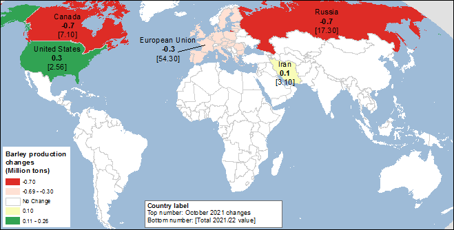 Карта 2. Изменения производства ячменя (млн. тонн) для 2021/22 года, октябрь 2021.