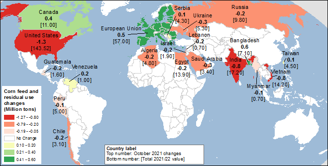 Карта 3. Изменения кормового и остаточного потребления кукурузы (млн. тонн) для 2021/22 года, октябрь 2021.
