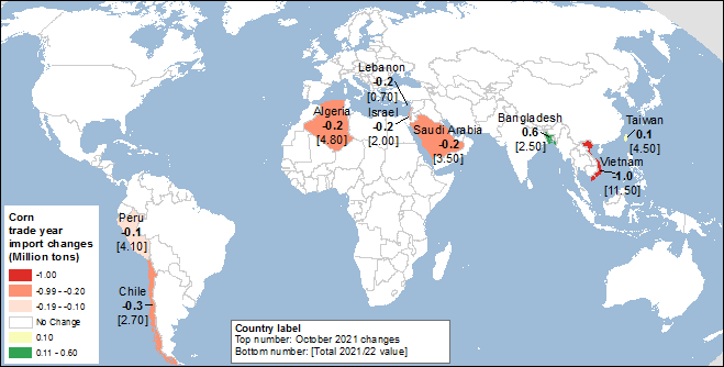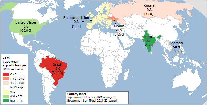 Мировая торговля кукурузой, прогнозируемая для международного 2021/22 торгового года с октября по сентябрь, в этом месяце сокращена на 1,5 миллиона тонн до все еще рекордных 190,9 миллиона, что на 8,1 миллиона тонн выше предыдущего рекорда 2020/21 года.