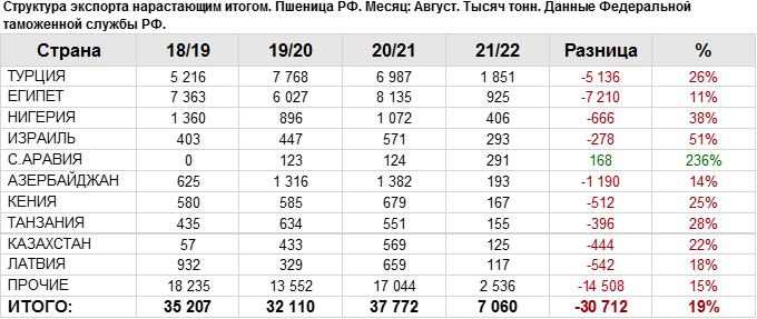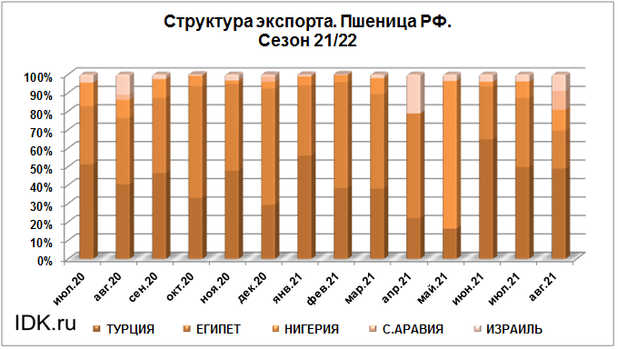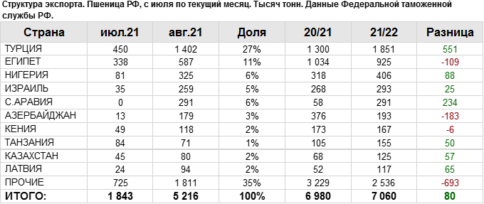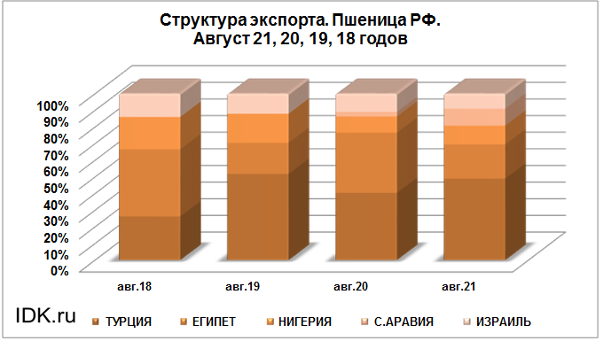 Объем поставок пшеницы на экспорт за период с июля 2021 года по август 2021 года в Турцию составил 1851.41 тыс. тонн, что на 551.11 тыс. тонн больше объема поставок в данную страну в прошлом сезоне на тот же отчетный месяц.