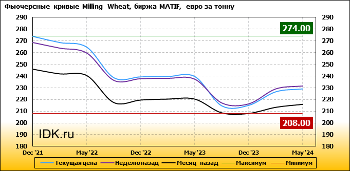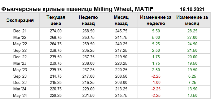 На 18.10.2021 стоимость пшеницы Milling Wheat на бирже MATIF по контракту Dec ’21 составила 274 евро за тонну. За прошедшую неделю стоимость пшеницы Milling Wheat выросла на 5.5 евро/тонна. Как мы видим на графике, фьючерсная кривая имеет периоды, когда более дальний фьючерс дешевле ближнего. Состояние бэквардации наблюдаем на следующих контрактах: Mar ’22; May ’22; Sep ’22; Sep ’23. Таким образом, трейдеры предполагают, что возможно превалирование предложения над спросом в указанные периоды.