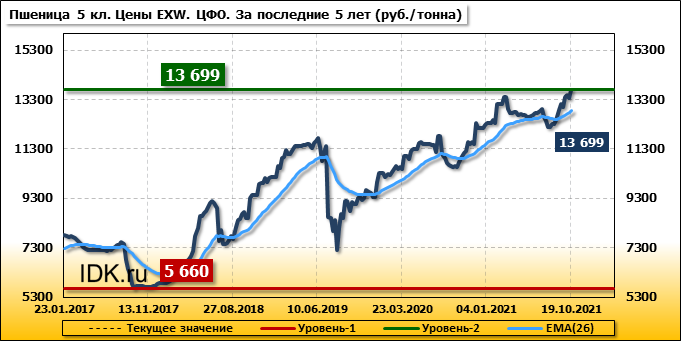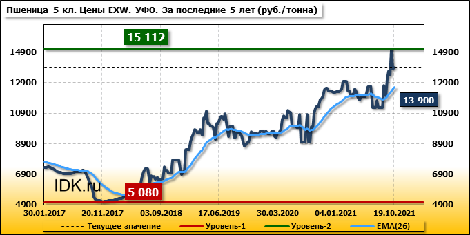 Цены на пшеницу 5-го класса повысились на 316 руб./т. и на данный момент составляют 13699 рублей за тонну.