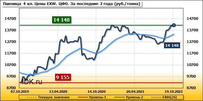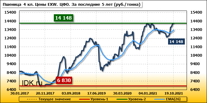 Цены на пшеницу 4-го класса поднялись на 1 руб./т. и на данный момент составляют 14148 рублей за тонну.