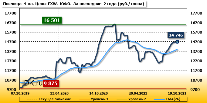 Цены на пшеницу 4-го класса поднялись на 29 руб./т. и на данный момент составляют 14746 рублей за тонну.