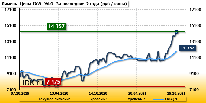 Внутренние цены на ячмень в Уральском федеральном округе выросли на 566 руб./т. и на данный момент составляют 14357 рублей за тонну.