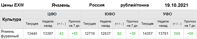 В Южном федеральном округе внутренние цены на ячмень выросли на 82 руб./т. и на данный момент составляют 12719 рублей за тонну.