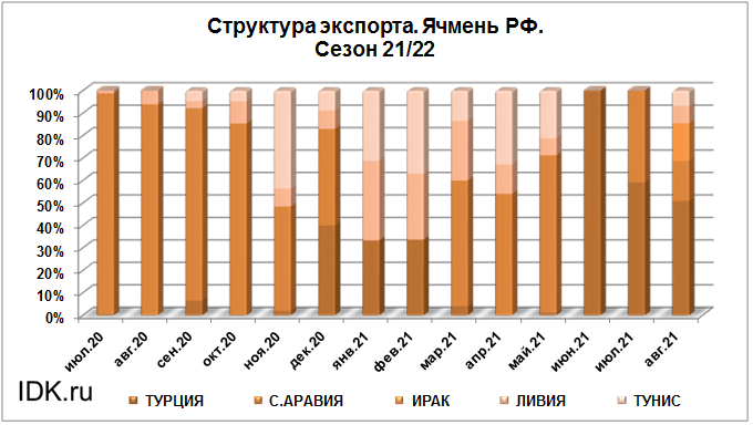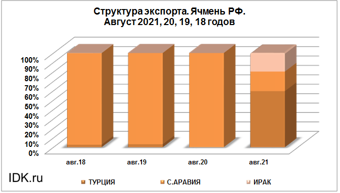 Объем поставок ячменя на экспорт за период с июля 2020 года по август 2021 года в Турцию составил 362.52 тыс. тонн, что на 359.41 тыс. тонн больше объема поставок в данную страну в прошлом сезоне на тот же отчетный месяц.