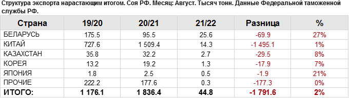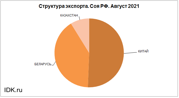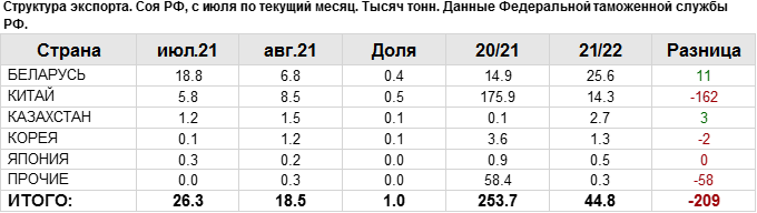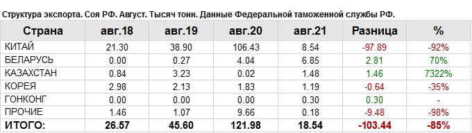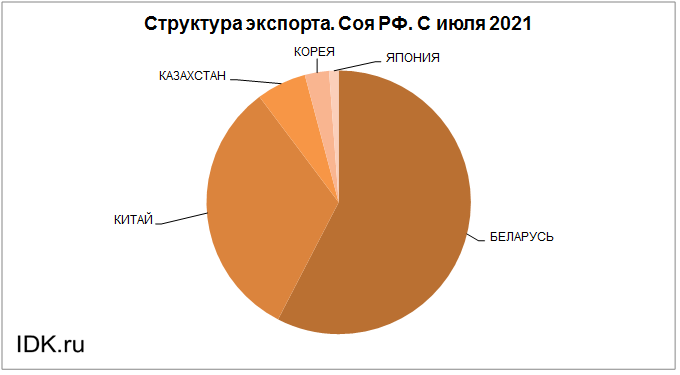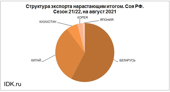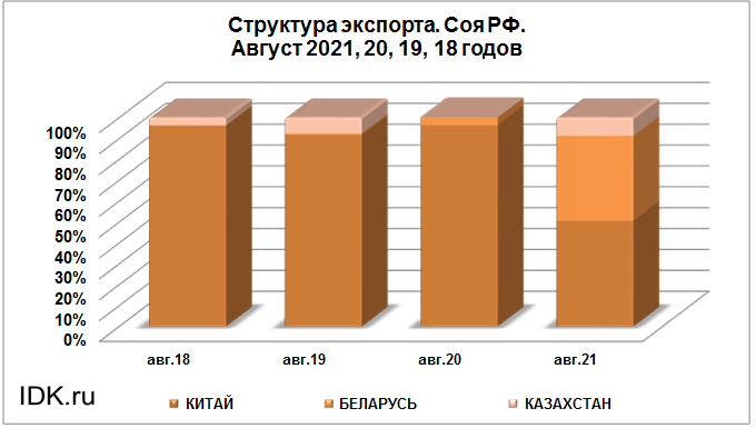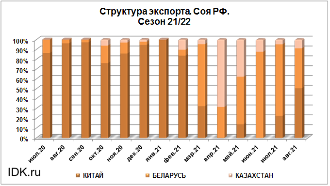 Объем поставок сои на экспорт за период с июля 2021 года по август 2021 года в Беларусь составил 25.63 тыс. тонн, что на 10.74 тыс. тонн больше объема поставок в данную страну в прошлом сезоне на тот же отчетный месяц.