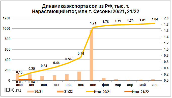 В текущем сезоне объем поставок сои на экспорт достиг 44.8 тыс. тонн. Данный объем на текущий момент составляет 2% от объема прошлого сезона.