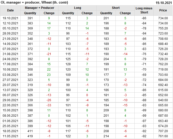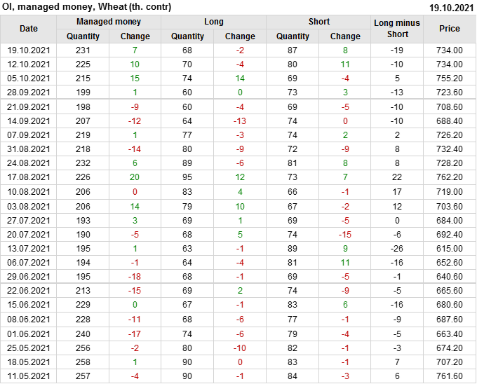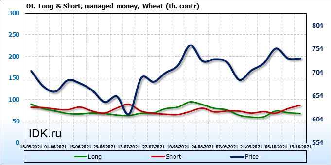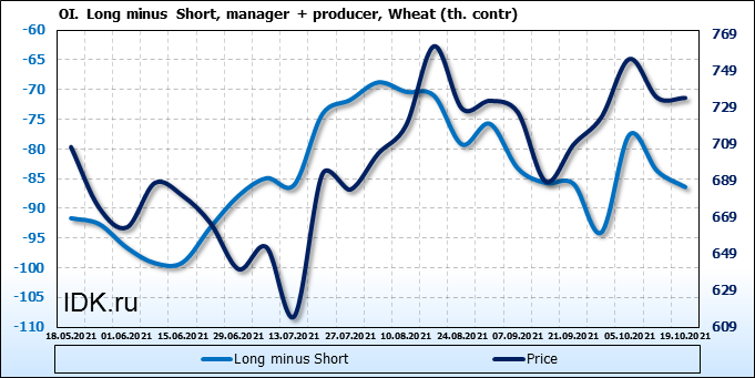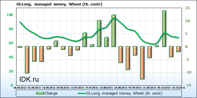За прошлую неделю, 13.10.21 — 19.10.21, разница между длинными и короткими позициями управляющих увеличилась на 9.5 тыс. контрактов. В тоже время, цена не изменилась и составляет цента.