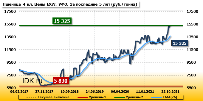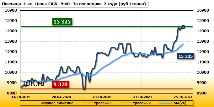 Цены на пшеницу 4-го класса поднялись на 88 руб./т. и на данный момент составляют 15325 рублей за тонну.
