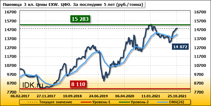 За прошедшую неделю в Центральном федеральном округе внутренние цены на пшеницу 3 класса выросли на 11 руб./т. и на данный момент составляют 14872 рубля за тонну.