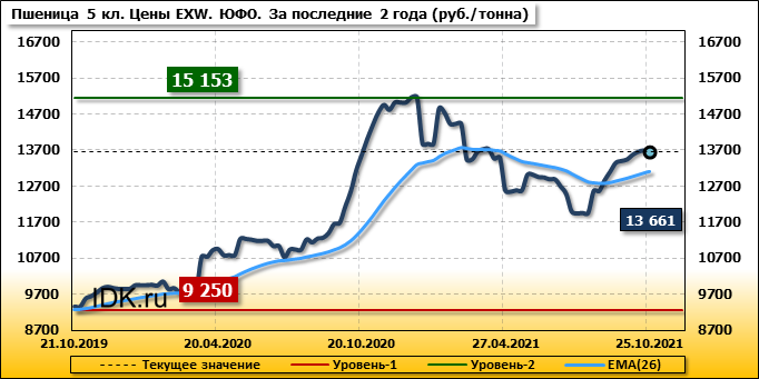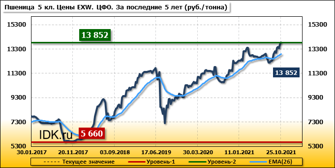 Цены на пшеницу 5-го класса повысились на 153 руб./т. и на данный момент составляют 13852 рубля за тонну.
