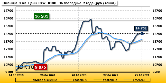 Цены на пшеницу 4-го класса поднялись на 6 руб./т. и на данный момент составляют 14752 рубля за тонну.