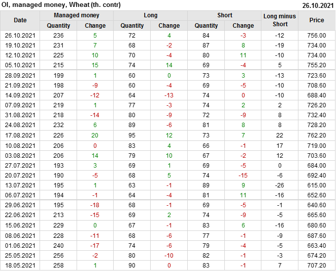 За прошлую неделю, 20.10.21 — 26.10.21, разница между длинными и короткими позициями управляющих сократилась на 7.9 тыс. контрактов. В тоже время, цена выросла на 22 цента.