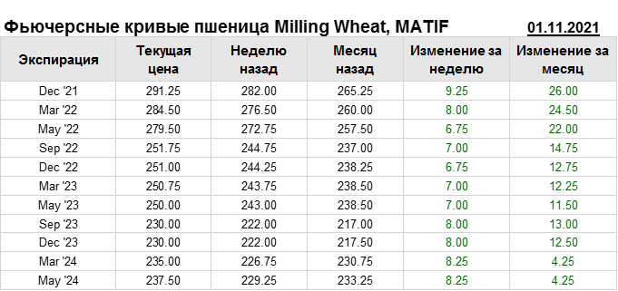На 01.11.2021 стоимость пшеницы Milling Wheat на бирже MATIF по контракту Dec ’21 составила 291.25 евро за тонну. За прошедшую неделю стоимость пшеницы Milling Wheat выросла на 9.25 евро/тонна. Как мы видим на графике, фьючерсная кривая имеет периоды, когда более дальний фьючерс дешевле ближнего. Состояние бэквардации наблюдаем на следующих контрактах: Mar ’22; May ’22; Sep ’22; Dec ’22; Mar ’23; May ’23; Sep ’23. Таким образом, трейдеры предполагают, что возможно превалирование предложения над спросом в указанные периоды.