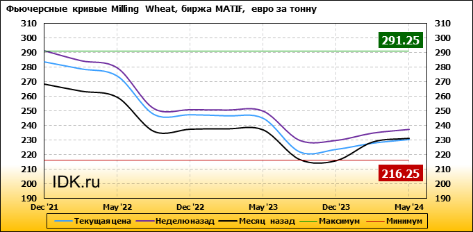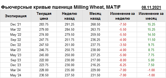 На 08.11.2021 стоимость пшеницы Milling Wheat на бирже MATIF по контракту Dec ’21 составила 283.75 евро за тонну. За прошедшую неделю стоимость пшеницы Milling Wheat упала на 7.5 евро/тонна. Как мы видим на графике, фьючерсная кривая имеет периоды, когда более дальний фьючерс дешевле ближнего. Состояние бэквардации наблюдаем на следующих контрактах: Mar ’22; May ’22; Sep ’22; Dec ’22; Mar ’23; May ’23; Sep ’23. Таким образом, трейдеры предполагают, что возможно превалирование предложения над спросом в указанные периоды.
