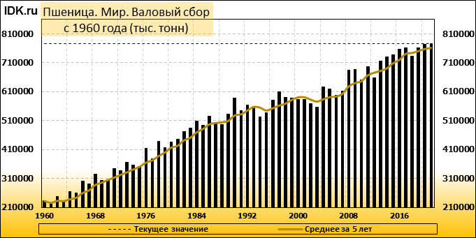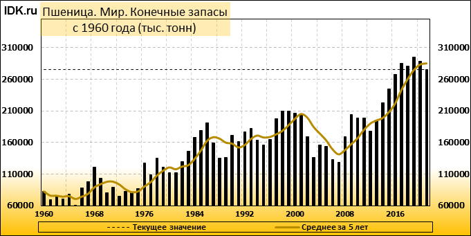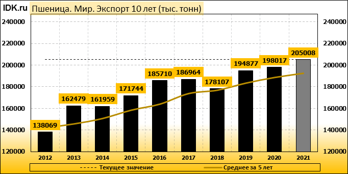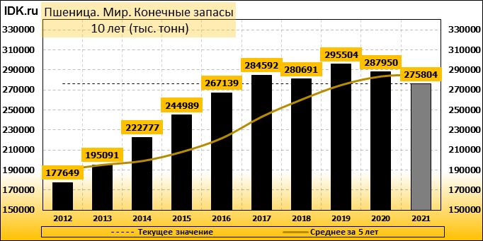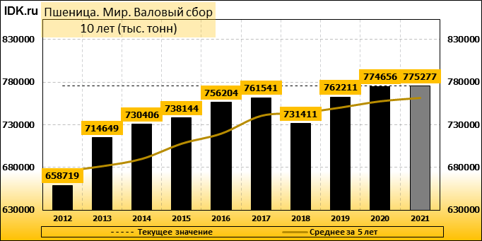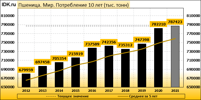 Глобальный прогноз по пшенице на 2021/22 год предусматривает сокращение запасов, небольшое повышение потребления, увеличение торговли и снижение конечных остатков. Прогноз по запасам снижен на 1,0 млн. тонн до 1 063,2 млн в связи с уменьшением начальных запасов и производства. Мировое производство снижено на 0,6 миллиона тонн до 775,3 миллиона, поскольку сокращение для ЕС, Великобритании и Узбекистана нивелирует рост в России. Мировое потребление увеличено на 0,4 миллиона тонн до 787,2 миллиона, в основном за счет кормового и остаточного потребления.