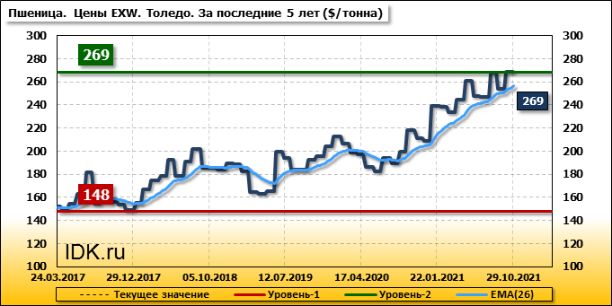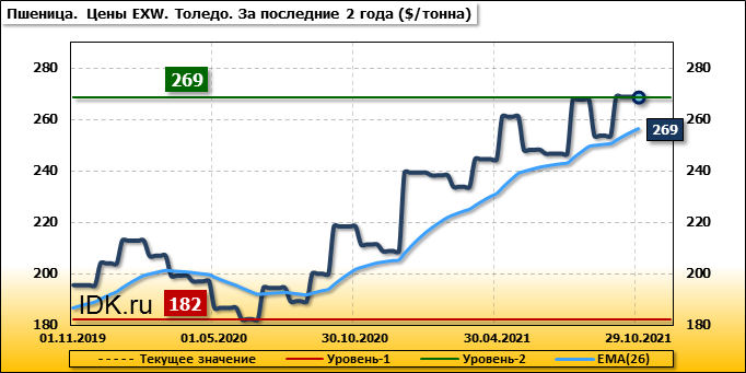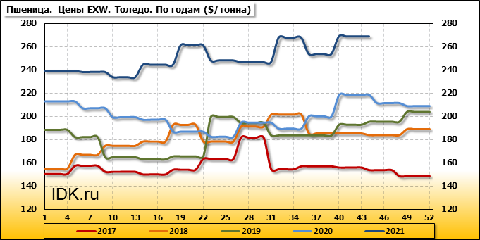 Внутренние цены на пшеницу SRW в городе Толедо (США) выросли на 15.1 $/т. и на отчетный месяц составляют 268.64 доллара за тонну.