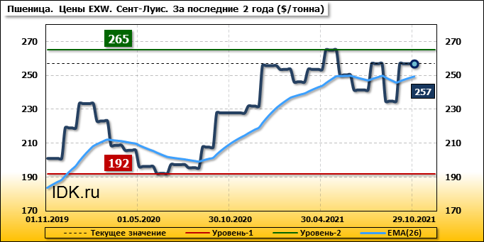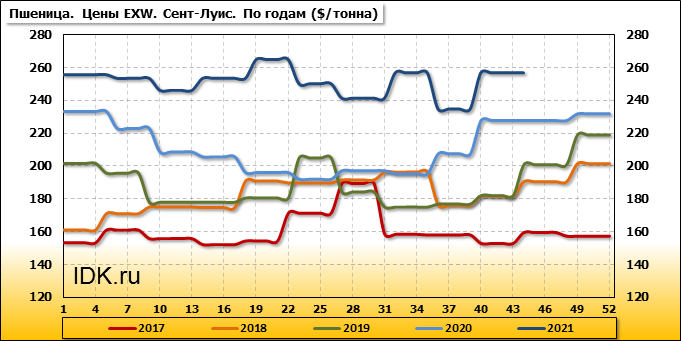 За прошедший месяц внутренние цены на пшеницу SRW в Сент-Луисе (США) выросли на 22.1 $/т. и на отчетный месяц составляют 256.86 доллара за тонну.