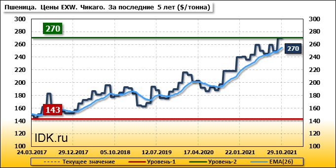 В Чикаго (США) внутренние цены на пшеницу SRW выросли на 21 $/т. и на отчетный месяц составляют 270.48 доллара за тонну.