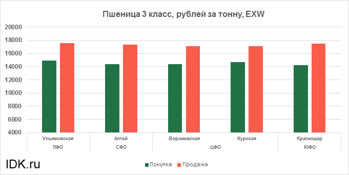 За прошедшую неделю с 08.11.2021 по 12.11.2021 средняя цена на пшеницу 3-го класса, согласно выставленным заявкам трейдеров, упала по всем округам на 158 рублей. Средняя цена составляет 15942 рубля за тонну.