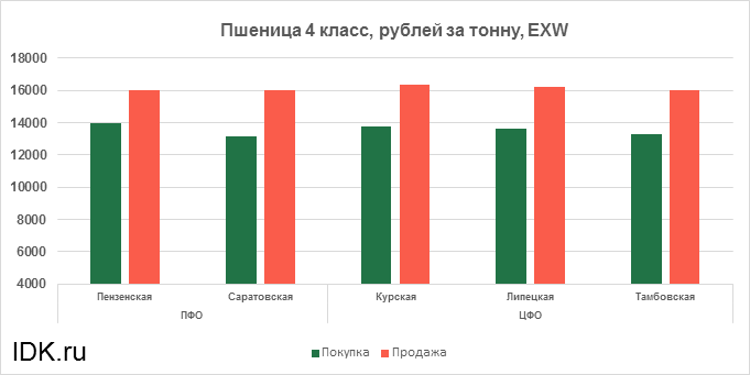 За прошедшую неделю с 08.11.2021 по 12.11.2021 средняя цена на пшеницу 4-го класса, согласно выставленным заявкам трейдеров, выросла по всем округам на 3 рубля. Средняя цена составляет 14904 рублей за тонну.