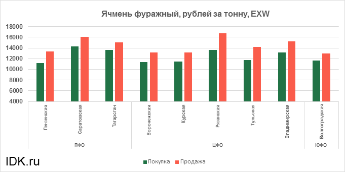 За прошедшую неделю с 08.11.2021 по 12.11.2021 средняя цена на фуражный ячмень, согласно выставленным заявкам трейдеров, упала по всем округам на 552 рубля. Средняя цена составляет 13137 рублей за тонну.