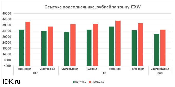 За прошедшую неделю с 08.11.2021 по 12.11.2021 средняя цена семечки подсолнечника, согласно выставленным заявкам трейдеров, выросла по всем округам на 684 рубля. Средняя цена составляет 36248 рублей за тонну.
