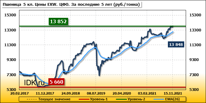 Цены на пшеницу 5-го класса повысились на 100 руб./т. и на данный момент составляют 13848 рублей за тонну.