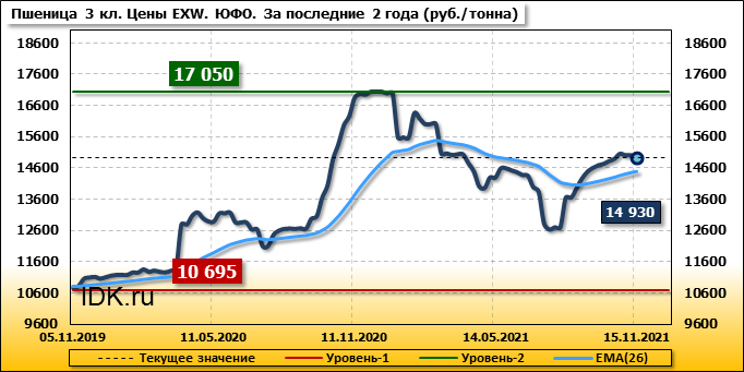 В Южном федеральном округе внутренние цены на пшеницу 3 класса упали на 87 руб./т. и на данный момент составляют 14930 рублей за тонну.