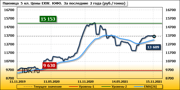 Цены на пшеницу 5-го класса понизились на 63 руб./т. и на данный момент составляют 13609 рублей за тонну.