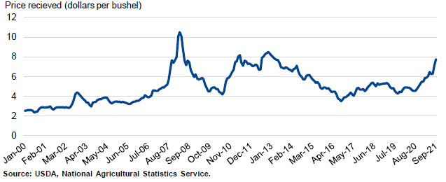 Среднесезонная цена на ферме (SAFP) на 2021/22 год повышена на 20 центов за бушель до 6,90 долларов США на основании сохраняющихся высоких цен на фермах, как сообщается в отчете Национальной службы сельскохозяйственной статистики (NASS) от 29 октября, а также роста фьючерсных и наличных цен. Цена на всю пшеницу в сентябре 2021 года составила 7,55 долларов США, по сравнению с 7,13 долларов США в августе 2021 года, и на 63 процента выше 4,73 долларов США в сентябре 2020 года. В течение последнего месяца фьючерсные цены росли, достигнув контрактных максимумов 1 ноября, прежде чем возникла тенденция к снижению на этой неделе. В частности, контракт на яровую пшеницу в Миннеаполисе вырос на 16 процентов с 1 октября и достиг 10,75 доллара за бушель, самого высокого уровня с июля 2008 года. Это фьючерсное ралли способствует ожиданиям того, что цена на пшеницу на ферме в ближайшие месяцы будет оставаться высокой.