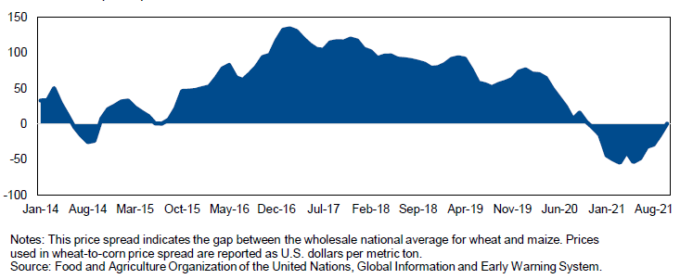 Общее мировое потребление пшеницы немного снижено на 371 000 тонн до 787,4 млн. тонн. Эта корректировка в основном вызвана пересмотром кормового и остаточного потребления в сторону понижения на 125 000 тонн, поскольку во всем мире пшеница становится все более дорогой для использования в кормовых рационах. Например, ценовой спрэд между пшеницей и кукурузой на внутреннем рынке Китая в октябре 2021 года практически пришел к паритету впервые с октября прошлого года (рисунок 2).