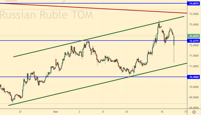 Нефть вновь на 82.00, а значит у рубля есть повод для укрепления. Европейцы активно ищут выход из ситуации сложившейся на границе Белоруссии и Польши. Поскольку контакты между сторонами идут, то это воспринимается как позитивное развитие событий. Рубль также может выиграть от хорошего окончания встречи США – Китай, которая проходит в эти часы.